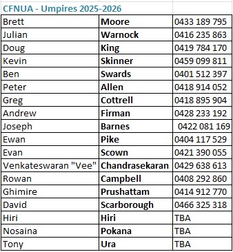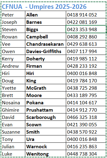 Contact information – Club grounds contacts and umpire mobile numbers are available here so umpires can contact those people when needed